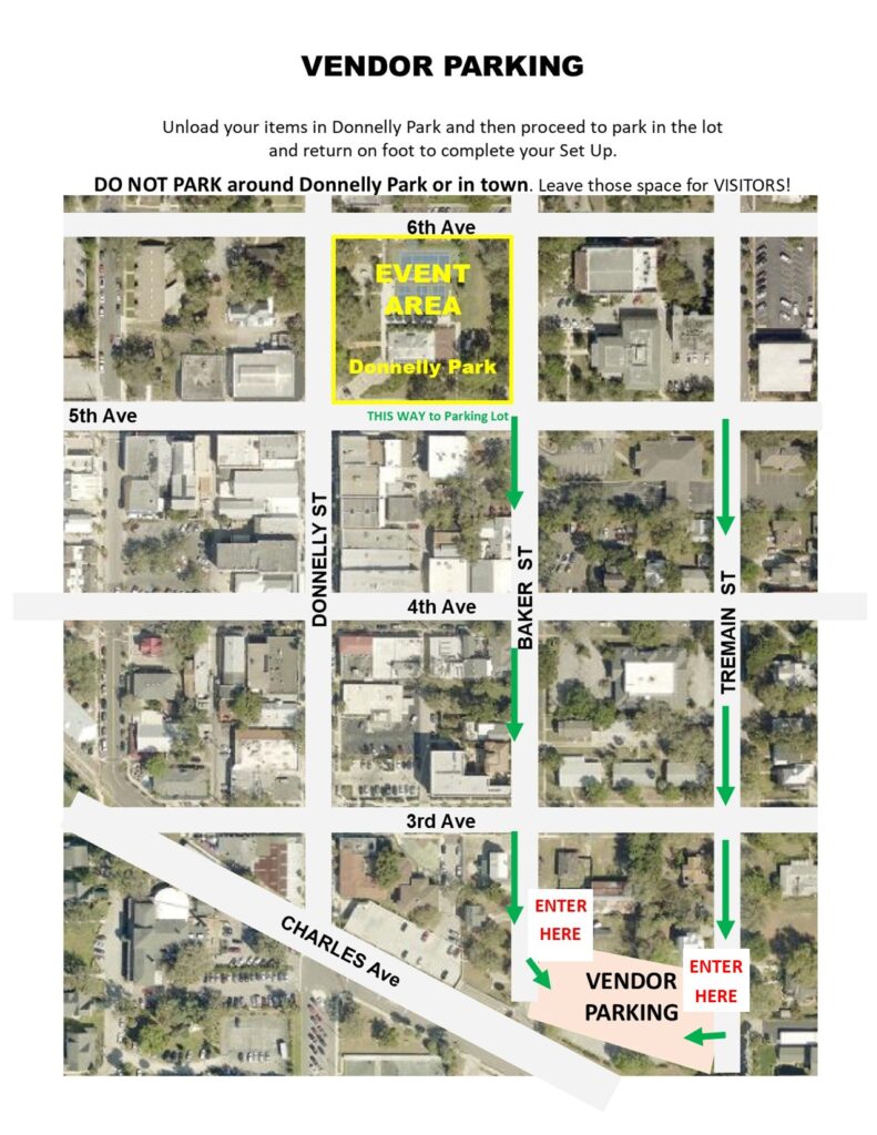 PARKING: You MUST park your vehicles in the Vendor Parking areas! (GPS 200 N. Baker St. Mount Dora) You can unload around the park but DO NOT leave your vehicle parked around the perimeter of Donnelly Park on Sat and Sun! Those spaces should be left open for guests.